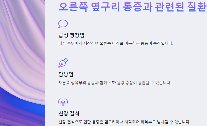 오른쪽 옆구리 통증과 관련된 주요 질환은 다음과 같습니다: