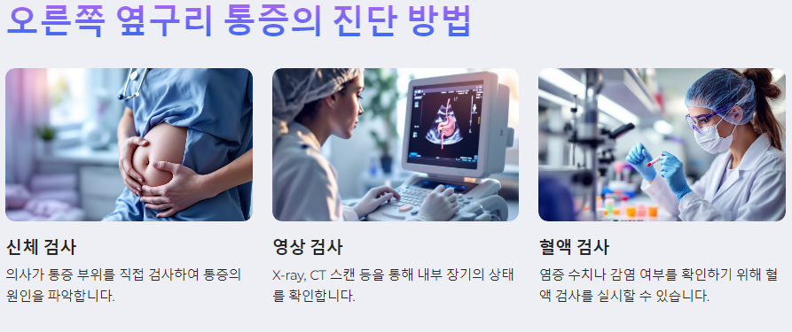 오른쪽 옆구리 통증의 진단은 다음과 같은 방법으로 이루어집니다: