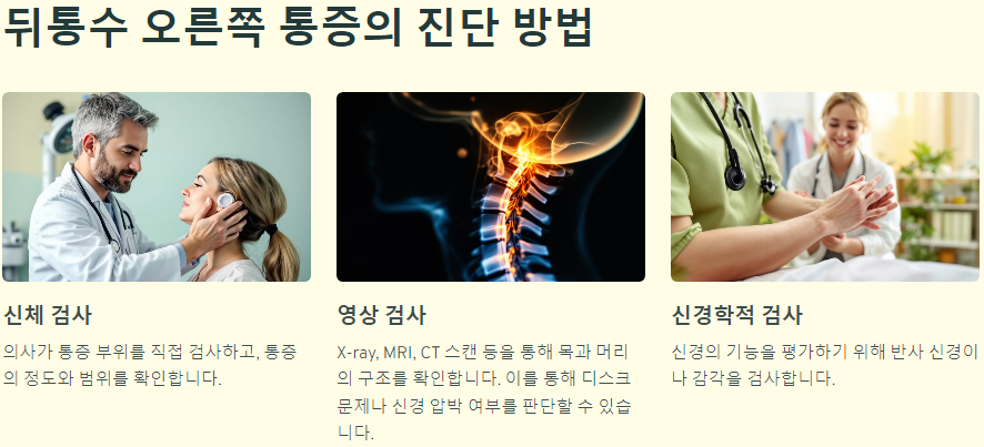 뒤통수 오른쪽 통증의 진단은 주로 다음과 같은 방법으로 이루어집니다.