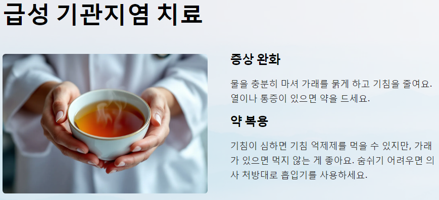 급성 기관지염은 대개 특별한 치료가 필요하지 않으며, 증상 완화를 위한 대증 치료가 주로 시행됩니다. 다음은 일반적인 치료 방법입니다: