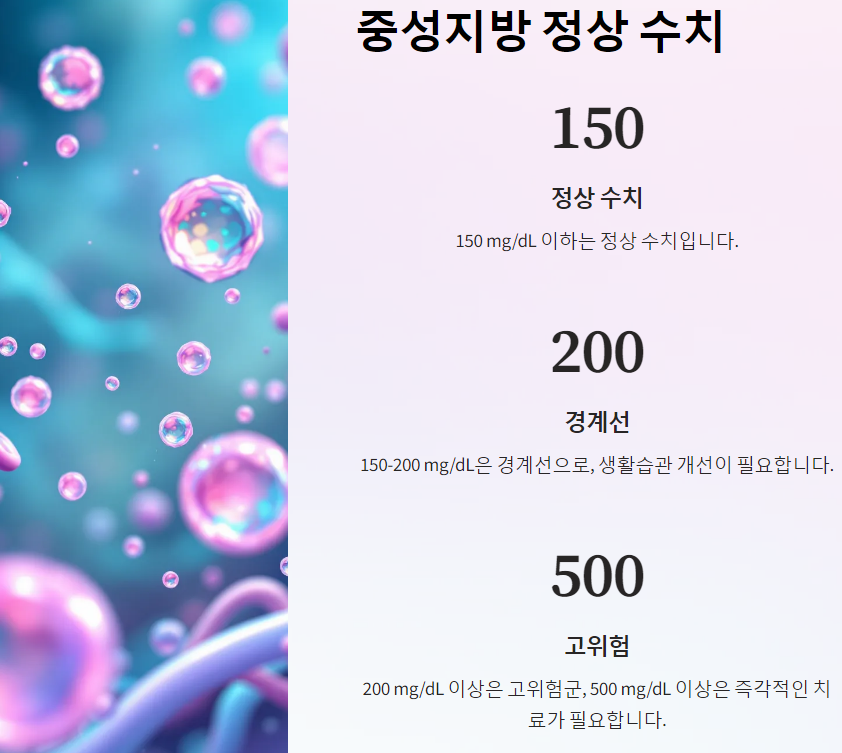 중성지방의 정상 수치는 150 mg/dL 이하입니다. 150-200 mg/dL은 경계선으로, 생활습관 개선이 필요합니다. 200 mg/dL 이상은 고위험군으로, 의학적 조치가 필요할 수 있습니다. 500 mg/dL 이상은 매우 높은 수치로, 즉각적인 치료가 요구됩니다.