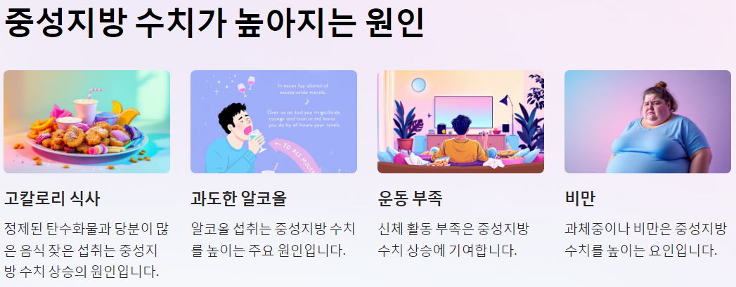 중성지방 수치가 높아지는 원인은 여러 가지가 있습니다. 주로 고칼로리 식사, 과도한 알코올 섭취, 운동 부족, 비만 등이 주요 원인으로 작용합니다. 특히, 정제된 탄수화물과 당분이 많은 음식을 자주 섭취하는 경우 중성지방 수치가 급격히 상승할 수 있습니다.