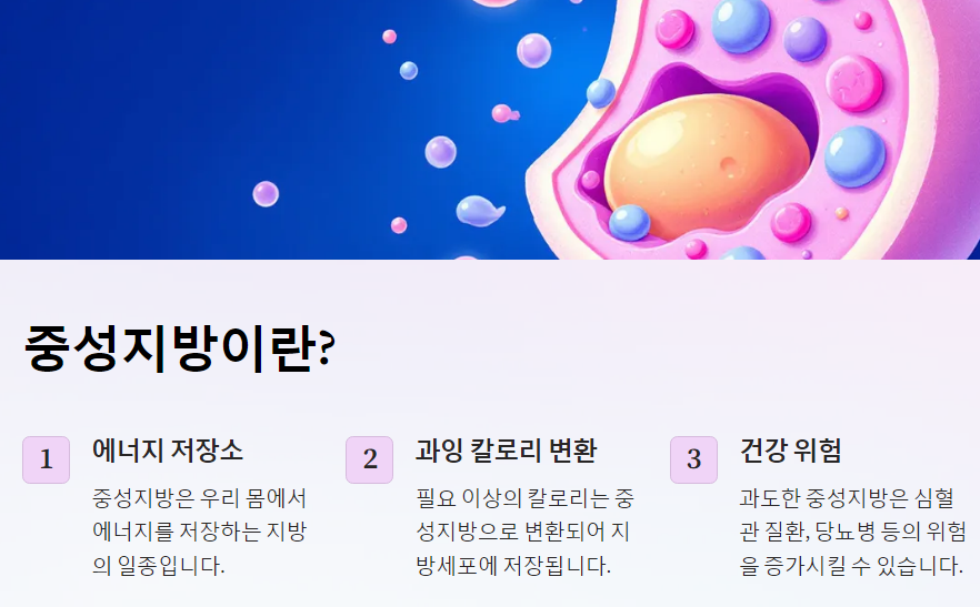 중성지방은 우리 몸에서 중요한 역할을 하지만, 수치가 높아지면 여러 건강 문제를 유발할 수 있습니다. 이번 포스팅에서는 중성지방에 대한 기본적인 이해부터 시작하여, 정상 수치, 높아지는 원인, 그리고 이를 낮추기 위한 다양한 방법에 대해 알아보겠습니다.