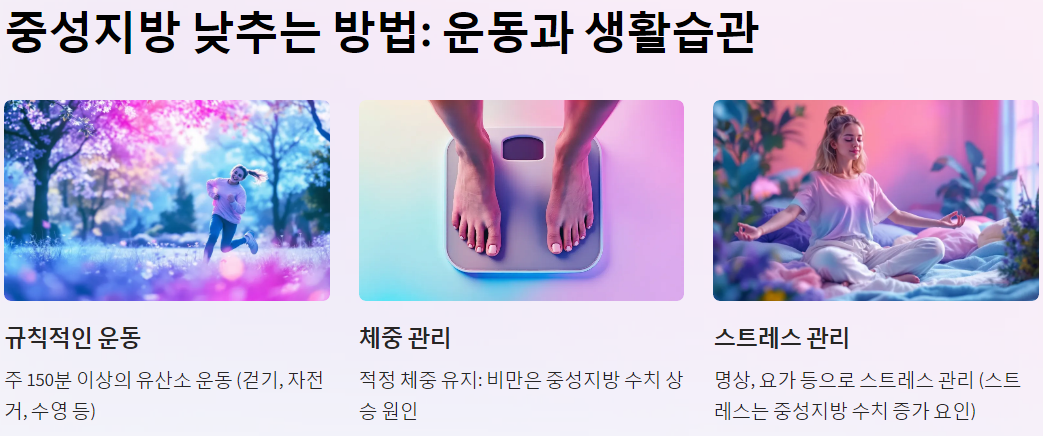 - 스트레스 관리 : 스트레스는 호르몬 변화를 유발하여 중성지방 수치를 높일 수 있습니다. 명상이나 요가 등을 통해 스트레스를 관리하세요.