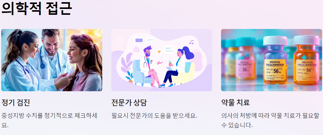 중성지방 수치가 매우 높은 경우, 의사의 처방에 따라 약물 치료가 필요할 수 있습니다. 특히, LDL 콜레스테롤 수치가 높거나 심혈관 질환의 위험이 있는 경우에는 더욱 주의가 필요합니다.