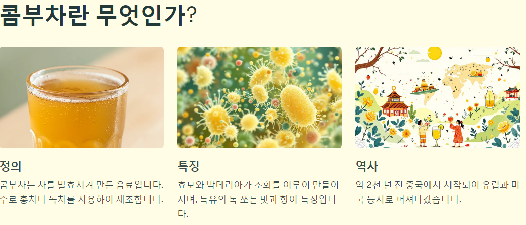 콤부차는 차를 발효시켜 만든 음료로, 주로 홍차나 녹차를 사용하여 제조합니다. 이 음료는 효모와 박테리아가 조화를 이루어 만들어지며, 특유의 톡 쏘는 맛과 향이 특징입니다. 콤부차는 약 2천 년 전부터 중국에서 시작된 것으로 알려져 있으며, 이후 유럽과 미국 등지로 퍼져 나갔습니다.