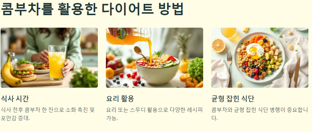 콤부차를 다이어트에 활용하는 방법은 간단합니다. 우선, 식사 전후에 콤부차 한 잔을 마시는 것이 좋습니다. 이렇게 하면 소화가 촉진되고, 포만감을 느낄 수 있어 식사량 조절에 도움을 줄 수 있습니다. 또한, 요리나 스무디에 콤부차를 활용하여 다양한 레시피를 시도해보는 것도 좋은 방법입니다.