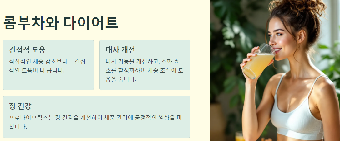 콤부차는 다이어트에 효과적인 음료로 많은 사람들이 찾고 있습니다. 하지만 직접적인 체중 감소 효과보다는 간접적인 도움이 더 크다고 할 수 있습니다. 콤부차는 대사 기능을 개선하고, 소화 효소를 활성화하여 체중 조절에 도움을 줄 수 있습니다. 또한, 콤부차에 포함된 프로바이오틱스는 장 건강을 개선하여 체중 관리에 긍정적인 영향을 미칠 수 있습니다.