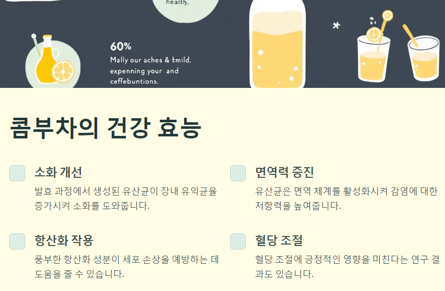 콤부차는 여러 가지 건강 효능으로 유명합니다. 첫째, 소화 개선 효과가 있습니다. 발효 과정에서 생성된 유산균이 장내 유익균을 증가시켜 소화를 도와줍니다. 둘째, 면역력 증진에 기여합니다. 유산균은 면역 체계를 활성화시켜 감염에 대한 저항력을 높여줍니다. 셋째, 콤부차는 항산화 성분이 풍부하여 세포 손상을 예방하는 데 도움을 줄 수 있습니다. 또한 혈당 조절에도 긍정적인 영향을 미친다는 연구 결과도 있습니다.