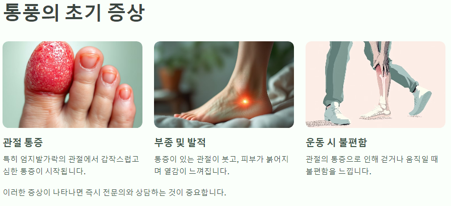 - 관절 통증 : 특히 엄지발가락의 관절에서 통증이 시작되는 경우가 많습니다. 통증은 갑작스럽게 발생하며, 매우 심한 경우가 많습니다.