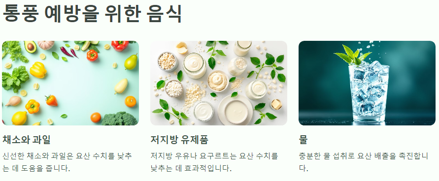 - 물 : 하루에 최소 2리터 이상의 물을 섭취하여 요산 배출을 촉진합니다.