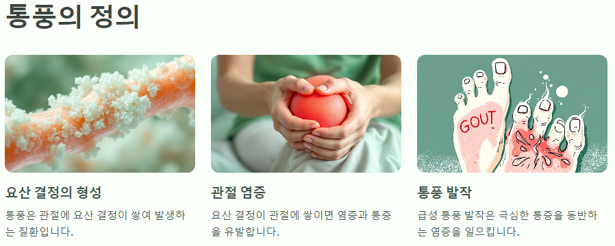 통풍은 체내에 요산이 과다하게 축적되어 발생하는 질환입니다. 요산은 신진대사 과정에서 생성되는 물질로, 일반적으로는 소변을 통해 배출됩니다. 그러나 요산이 과다하게 생성되거나 배출이 원활하지 않을 경우, 혈중 요산 농도가 높아지게 되고, 이로 인해 관절에 염증이 발생하게 됩니다. 통풍은 주로 발가락, 발목, 무릎 등 관절에 통증을 유발하며, 급성 통풍 발작이 발생할 수 있습니다.