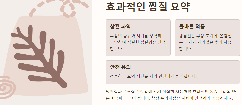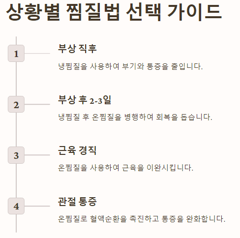 상황에 따라 적절한 찜질법을 선택하는 것이 중요합니다. 예를 들어, 운동 후 근육이 뻣뻣해졌다면 온찜질이 효과적이며, 넘어져서 멍이 들었다면 냉찜질이 필요합니다.