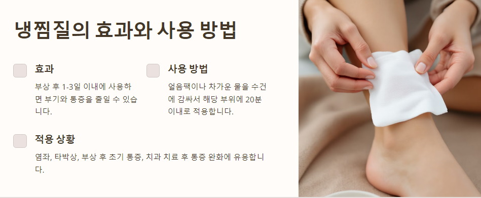 냉찜질은 주로 부상 후 1-3일 이내에 사용해야 효과적입니다. 이 시기에 냉찜질을 통해 부기와 통증을 줄일 수 있습니다. 사용 방법은 간단합니다. 얼음팩이나 차가운 물을 수건에 감싸서 해당 부위에 20분 이내로 적용합니다. 이때 주의할 점은 너무 오랜 시간 동안 찜질하지 않는 것입니다.