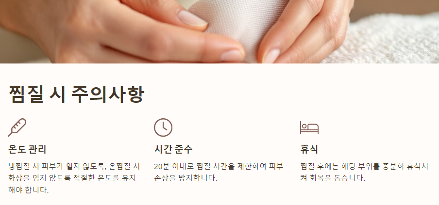 찜질을 할 때는 몇 가지 주의사항이 있습니다. 냉찜질을 할 때는 피부가 얼지 않도록 주의하고, 온찜질을 할 때는 화상을 입지 않도록 적절한 온도를 유지해야 합니다. 또한, 찜질 후에는 해당 부위를 충분히 휴식시켜야 합니다.