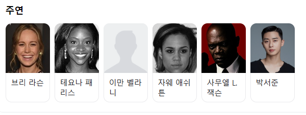 감독과 출연진들을 보면 니아 타코스타 감독, 주연은 브리 라슨 , 테요나 패리스 , 이만 벨라니 , 자웨 애쉬튼 , 사무엘 L. 잭슨 박서준 님이 나오셨습니다.