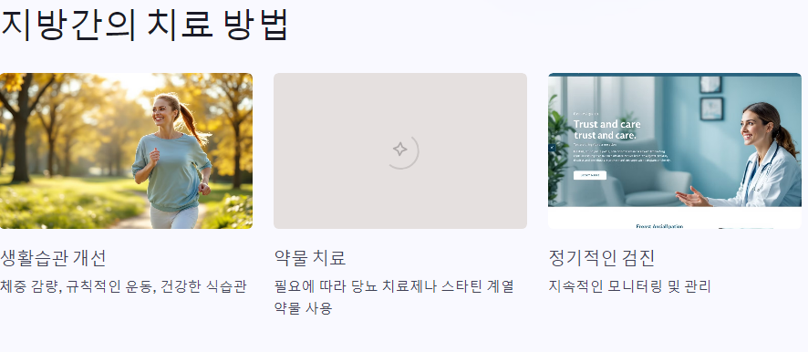 지방간의 치료는 주로 생활습관 개선에 초점을 맞춥니다. 체중 감량, 규칙적인 운동, 건강한 식습관이 중요합니다. 또한, 필요에 따라 약물 치료가 필요할 수 있습니다. 예를 들어, 당뇨 치료제나 스타틴 계열 약물이 사용될 수 있습니다.