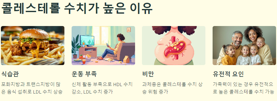 - 유전적 요인 : 가족력이 있는 경우, 유전적으로 콜레스테롤 수치가 높을 수 있습니다.