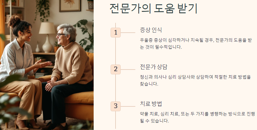 우울증 증상이 심각하거나 지속될 경우, 전문가의 도움을 받는 것이 필수적입니다. 정신과 의사나 심리 상담사와 상담하여 적절한 치료 방법을 찾는 것이 중요합니다. 치료는 약물 치료, 심리 치료, 또는 두 가지를 병행하는 방식으로 진행될 수 있습니다.