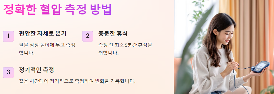 정확한 혈압 측정은 고혈압 관리의 첫걸음입니다. 혈압을 측정할 때는 다음과 같은 방법을 따르는 것이 좋습니다.