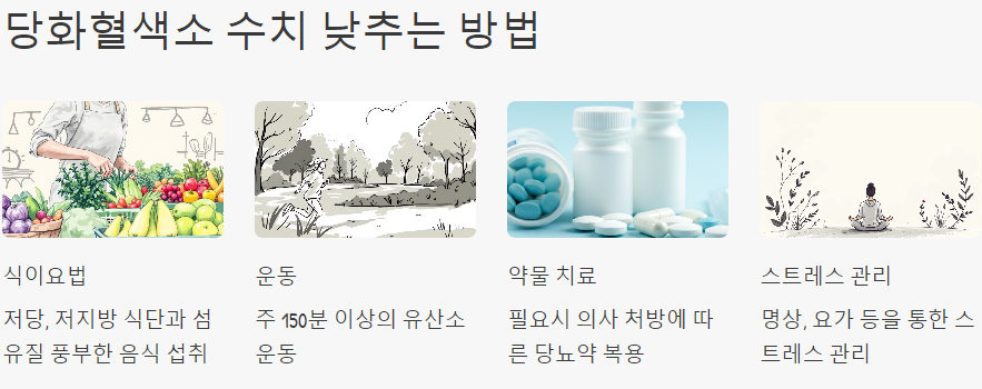 당화혈색소 수치를 낮추기 위해서는 다음과 같은 방법들이 있습니다: