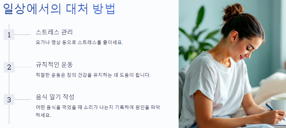 • 음식 일기 작성 : 어떤 음식을 먹었을 때 소리가 나는지 기록하여 원인을 파악하는 것도 좋은 방법입니다.