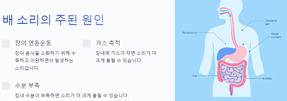 • 수분 부족 : 장내 수분이 부족하면 소리가 더 크게 들릴 수 있습니다.