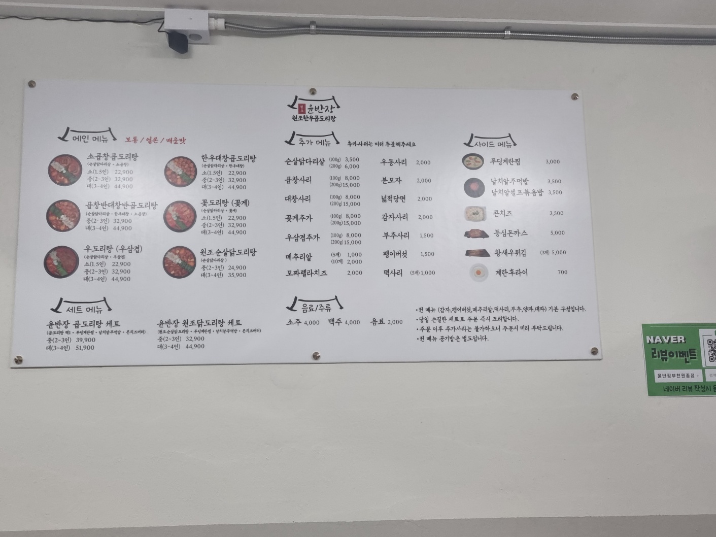 메인메뉴인 곱도리탕 과 메인 메뉴 드시다가 모자르시면 추가 메뉴에 닭다리살 , 곱창 , 꽃게 등 있으니 추가 해서 드시면 될꺼같아요~~ 사이드 메뉴도 가격이 저렴합니당~~~ 특히 소주 맥주가 4,000원!!! ^^ ㅎ ㅏ ~ 요즘 4,000원 보기도 힘들어요 ㅠㅠ....