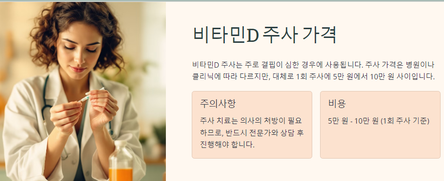 비타민D 주사는 주로 결핍이 심한 경우에 사용됩니다. 주사 가격은 병원이나 클리닉에 따라 다르지만, 대체로 1회 주사에 5만 원에서 10만 원 사이입니다. 주사 치료는 의사의 처방이 필요하므로, 반드시 전문가와 상담 후 진행해야 합니다.