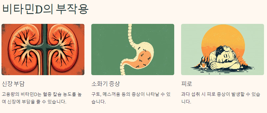 비타민D는 일반적으로 안전하지만, 과다 섭취 시 부작용이 발생할 수 있습니다. 고용량의 비타민D는 혈중 칼슘 농도를 높여 신장에 부담을 줄 수 있으며, 구토, 메스꺼움, 피로 등의 증상이 나타날 수 있습니다. 따라서, 적정량을 섭취하는 것이 중요합니다.