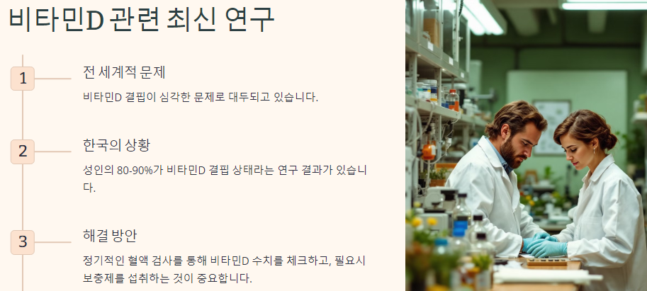 최근 연구에 따르면, 비타민D 결핍이 전 세계적으로 심각한 문제로 대두되고 있습니다. 많은 사람들이 비타민D 수치가 낮아 면역력 저하 및 여러 질병에 노출되고 있습니다. 특히, 한국에서는 성인의 80-90%가 비타민D 결핍 상태라는 연구 결과도 있습니다. 이러한 문제를 해결하기 위해서는 정기적인 혈액 검사를 통해 비타민D 수치를 체크하고, 필요시 보충제를 섭취하는 것이 중요합니다