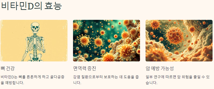 비타민D는 여러 가지 효능을 가지고 있습니다. 첫째, 뼈 건강을 유지하는 데 필수적입니다. 비타민D가 부족하면 뼈가 약해지고 골다공증의 위험이 증가합니다. 둘째, 면역력을 높여 감염병에 대한 저항력을 강화합니다. 셋째, 최근 연구에 따르면 비타민D는 암 예방에도 효과적이라는 결과가 나왔습니다. 특히, 대장암의 위험을 50% 이상 줄일 수 있다는 연구 결과도 있습니다