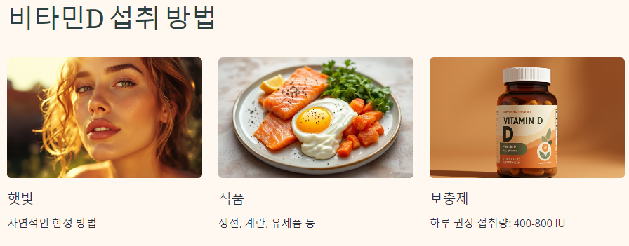 비타민D는 햇빛을 통해 자연적으로 합성되지만, 음식으로도 섭취할 수 있습니다. 생선, 계란, 유제품 등이 비타민D가 풍부한 식품입니다. 또한, 비타민D 보충제를 통해 추가 섭취할 수 있습니다. 성인의 경우 하루 권장 섭취량은 400-800 IU입니다.