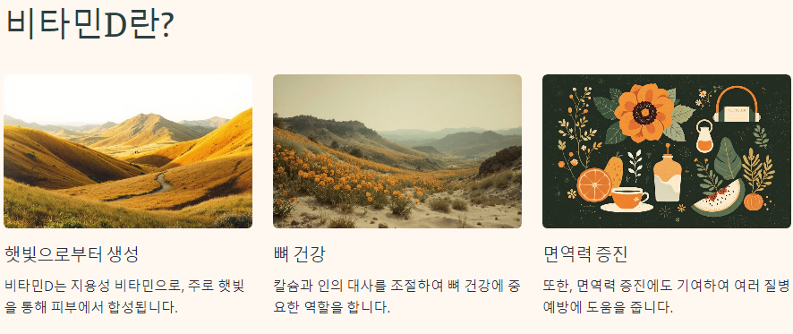 비타민D는 지용성 비타민으로, 주로 햇빛을 통해 피부에서 합성됩니다. 이 비타민은 칼슘과 인의 대사를 조절하여 뼈 건강에 중요한 역할을 합니다. 또한, 면역력 증진에도 기여하여 여러 질병 예방에 도움을 줍니다.