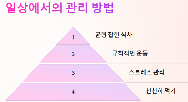 복부팽만을 예방하기 위해서는 일상에서의 관리가 중요합니다. 스트레스를 줄이고, 규칙적인 운동을 하며, 균형 잡힌 식사를 하는 것이 좋습니다. 또한, 음식을 먹을 때는 편안한 환경에서 천천히 먹는 것이 중요합니다.