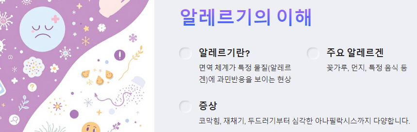 알러지는 면역 체계가 특정 물질에 대해 과민반응을 보이는 현상입니다. 일반적으로 알러지를 일으키는 물질을 '알러겐'이라고 하며, 대표적으로 꽃가루, 먼지, 특정 음식 등이 있습니다. 알러지 증상은 다양하며, 코막힘, 재채기, 두드러기, 심한 경우에는 아나필락시스와 같은 생명을 위협하는 반응이 나타날 수 있습니다.