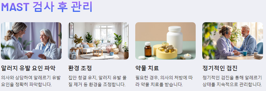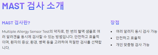MAST(Multiple Allergy Sensor Test) 검사는 한 번의 혈액 샘플로 여러 알러겐을 동시에 검사할 수 있는 편리한 방법입니다. 이 검사는 환자의 증상, 환경, 병력 등을 바탕으로 적절한 검사를 선택하여 이루어집니다. MAST 검사는 안전하고 효율적이며, 여러 알러지를 한꺼번에 검사할 수 있기 때문에 많은 환자들에게 추천됩니다.