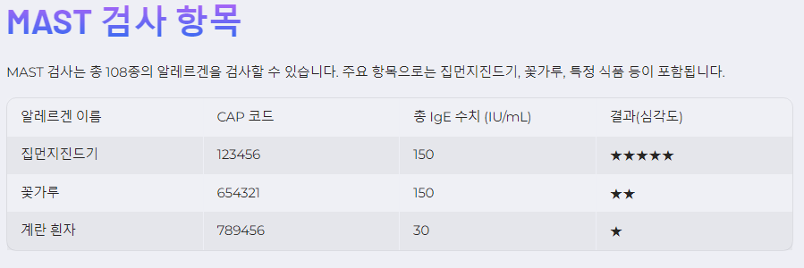 MAST 검사는 총 108종의 알러겐을 검사할 수 있으며, 일반적인 항목으로는 집먼지 진드기, 꽃가루, 특정 식품 등이 포함됩니다. 아래 표는 검사 가능한 알러겐 목록을 보여줍니다.