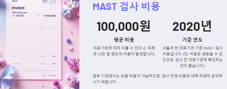 MAST 검사 비용은 의료기관에 따라 다를 수 있으나, 대체로 100,000원 정도의 비용이 발생합니다. 일부 기관에서는 보험 적용도 가능하므로, 환자들은 검사 전에 비용에 대한 자세한 문의가 필요합니다. 예를 들어, 2020년 기준으로 서울의 한 의료기관에서는 MAST 검사가 약 100,000원이었습니다.