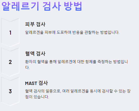 알러지 검사는 일반적으로 두 가지 방법으로 이루어집니다. 첫 번째는 피부 검사이며, 알러겐을 피부에 도포하여 반응을 관찰하는 방법입니다. 두 번째는 혈액 검사로, 환자의 혈액을 통해 알러겐에 대한 항체를 측정하는 방법입니다. MAST 검사는 혈액 검사의 일종으로, 여러 알러겐을 동시에 검사할 수 있는 장점이 있습니다.