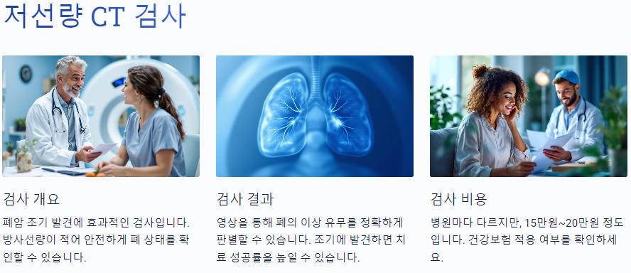 저선량 CT 검사는 폐암을 조기에 발견하기 위한 검사 방법 중 하나입니다. 일반 CT 검사보다 방사선 노출량이 적어, 건강에 미치는 영향을 최소화하면서도 폐의 상태를 정확하게 진단할 수 있습니다. 저선량 CT 검사는 특히 고위험군(예: 흡연자, 가족력 있는 경우)에게 권장됩니다.