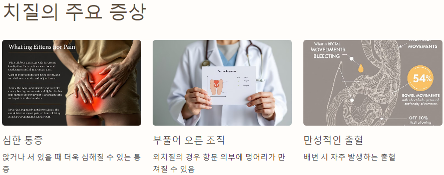 치질이 진행되면 다음과 같은 주요 증상이 발생할 수 있습니다.