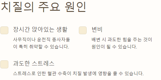 - 고령: 나이가 들수록 혈관의 탄력이 감소하여 치질이 발생하기 쉬워집니다.
