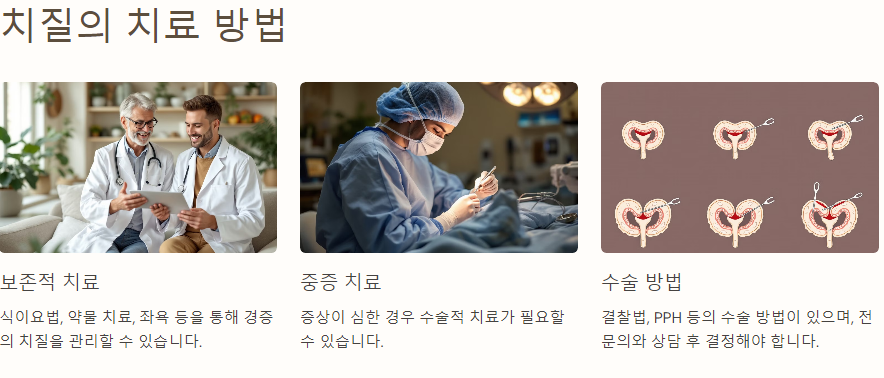 - 결찰법: 치질 조직을 결찰하여 혈류를 차단합니다.