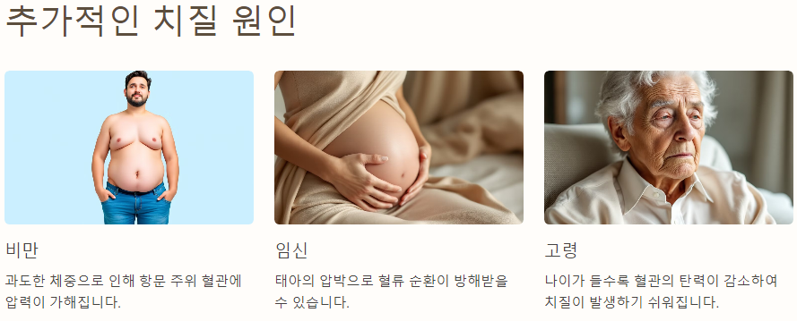 - 비만: 체중이 많이 나가면 항문 주위 혈관에 압력이 가해집니다.