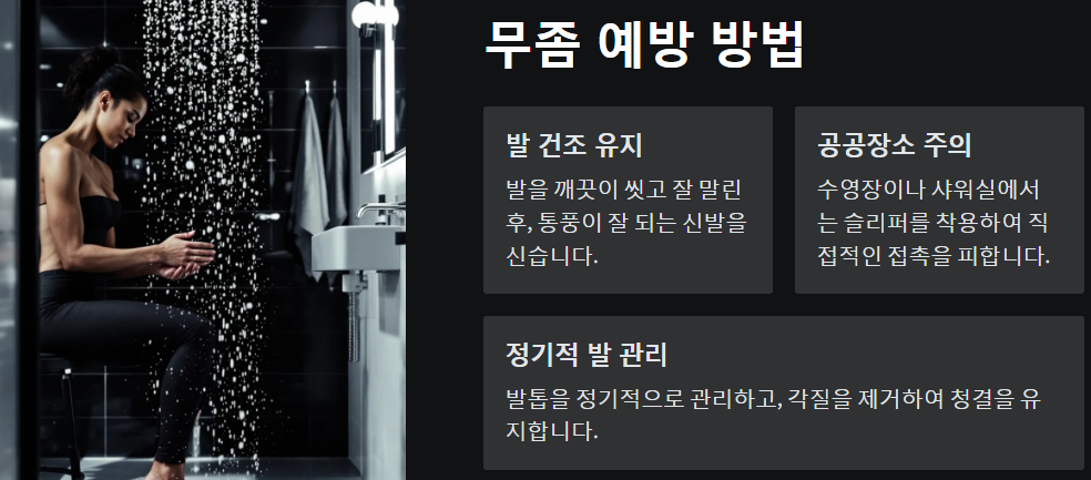 - 발을 건조하게 유지 : 발을 깨끗이 씻고 잘 말린 후, 통풍이 잘 되는 신발을 신습니다.