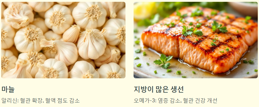 연어, 고등어, 청어와 같은 지방이 많은 생선은 오메가-3 지방산이 풍부하여 혈액순환에 매우 좋습니다. 오메가-3 지방산은 염증을 줄이고, 혈관 건강을 개선하는 데 도움을 줍니다.