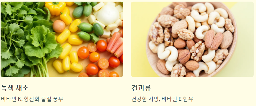 시금치, 브로콜리와 같은 녹색 채소는 비타민 K와 항산화 물질이 풍부하여 혈액순환을 개선하는 데 효과적입니다. 이러한 채소들은 샐러드나 스무디로 섭취하면 좋습니다.