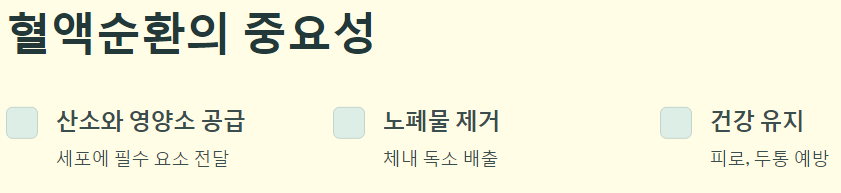 혈액순환은 우리 몸의 모든 세포에 산소와 영양소를 공급하고, 노폐물을 제거하는 역할을 합니다. 혈액순환이 원활하지 않으면 피로감, 두통, 손발 저림 등의 증상이 나타날 수 있으며, 장기적으로는 심각한 건강 문제로 이어질 수 있습니다. 따라서, 혈액순환을 개선하기 위해서는 적절한 식습관이 필수적입니다.