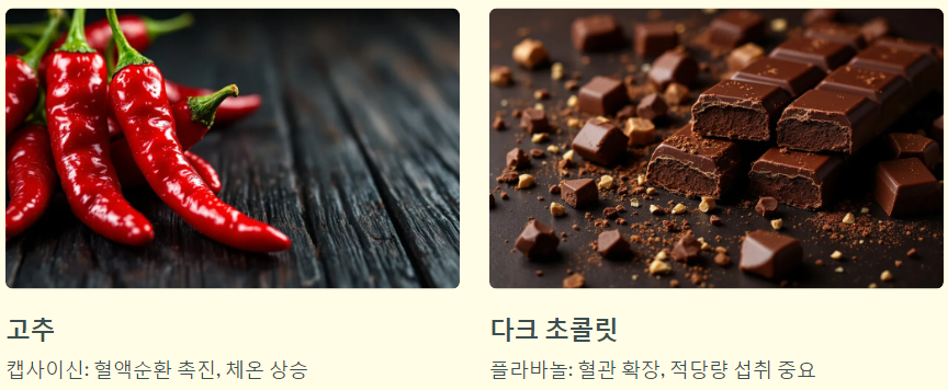 고추에 포함된 캡사이신 성분은 혈액순환을 촉진하고, 체온을 높여주는 효과가 있습니다. 매운 음식을 좋아하신다면 고추를 활용한 요리를 추천합니다.